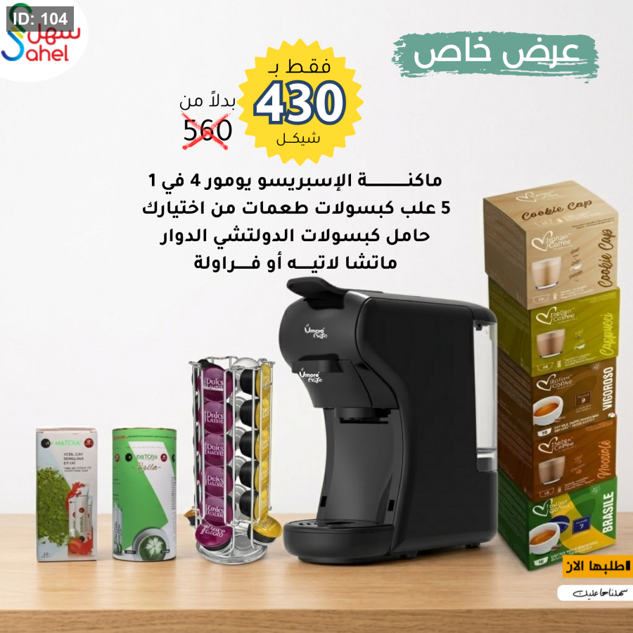 صُممت ماكنة الإسبريسو يومور 4 في 1 لتمنحك أكثر من طريقة لتحضير قهوتك بسهولة وسرعة، لتستمتع بمذاق المقاهي في أي وقت.